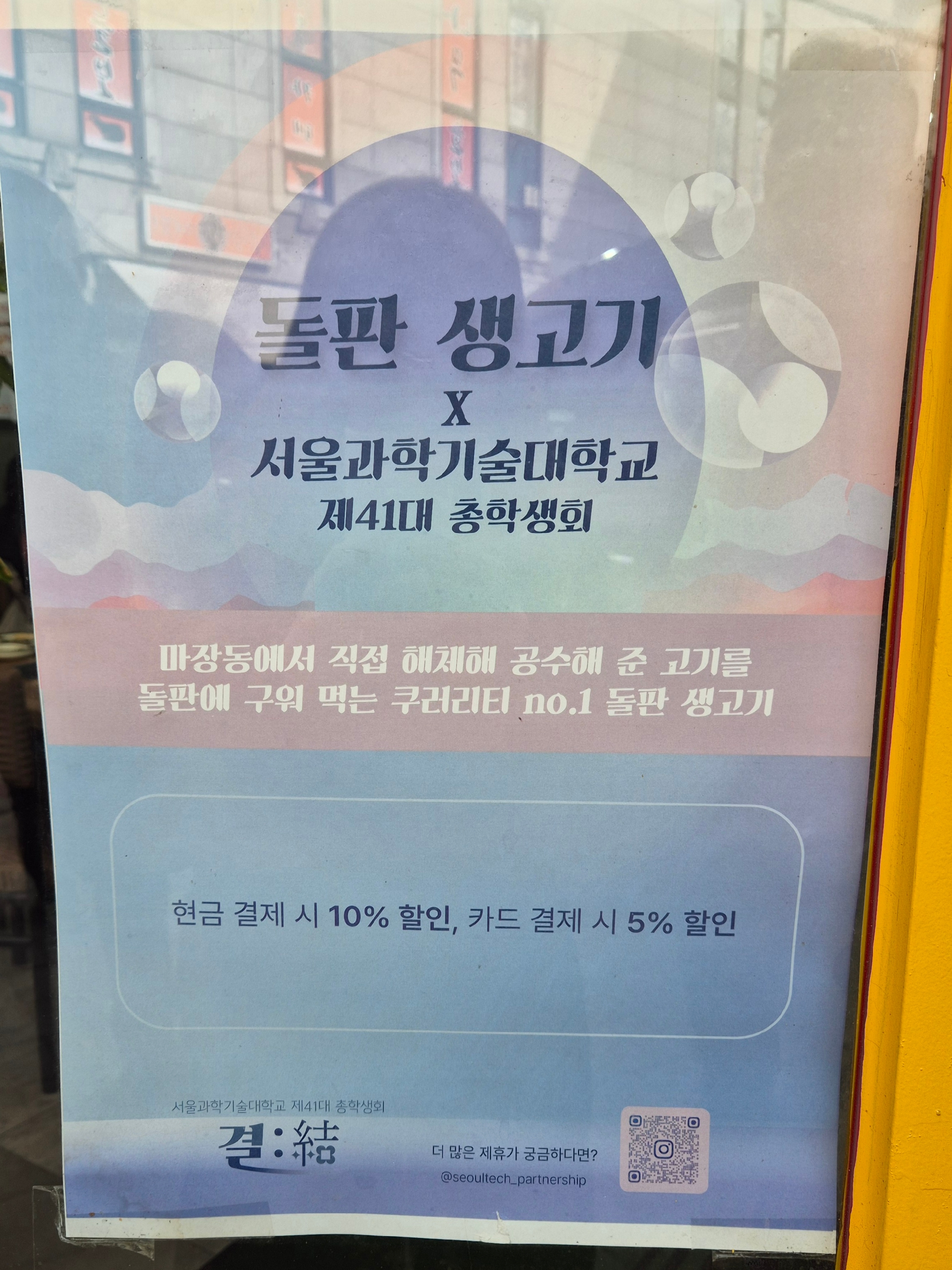 *돌판생고기에서는 재학생에 한해 전체 이용금액을 현금으로 결제시 10%, 카드로 결제시 5% 할인 되오니 참고 부탁드립니다.*