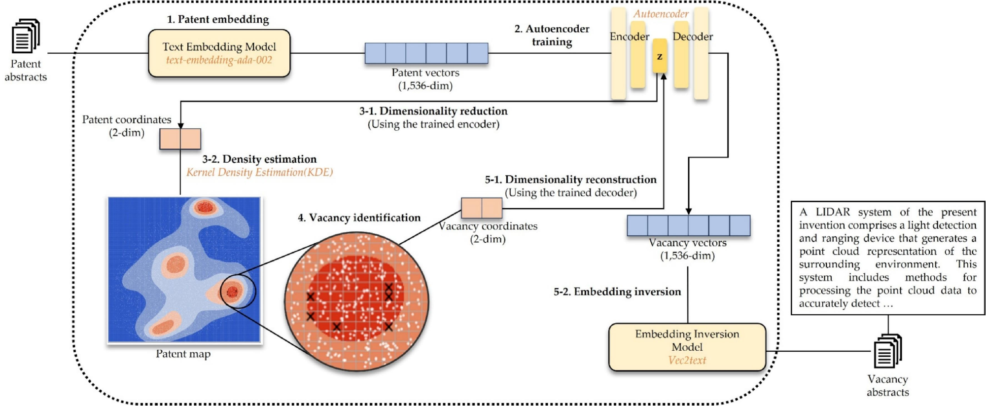 이학연 교수 연구팀은 이러한 문제를 해결하기 위해 오토인코더(autoencoder) 및 임베딩 역변환(embedding inversion) 모델을 활용한 새로운 접근법을 개발하였다. 이 기술은 수만 건의 특허 초록을 고차원 벡터로 임베딩하고, 오토인코더를 통해 2차원 특허 지도에 시각화하여, 지도상에서 특허가 등록되지 않은 빈 공간(공백)의 좌표를 식별한다. 이 좌표를 1,536차원으로 복원한 벡터를 vec2text 모델에 입력함으로써, 인간이 이해할 수 있는 특허 초록 형태의 상세한 기술 텍스트를 생성해 낸다.