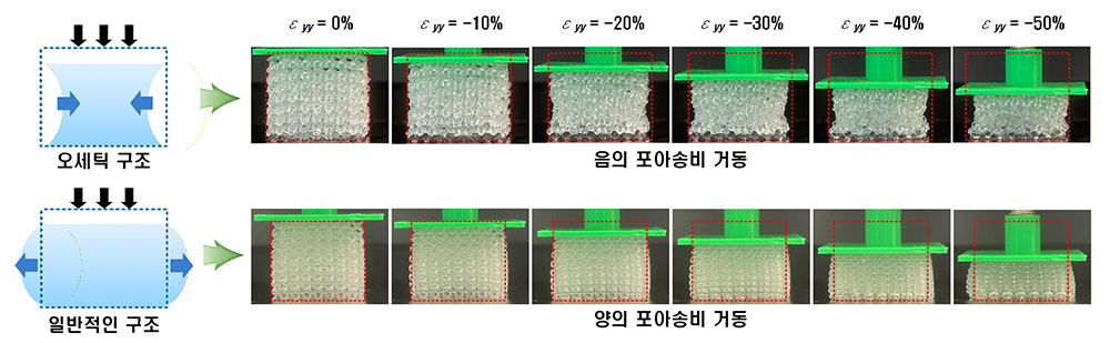 기존의 폼(foam)이나 다공성 구조를 활용한 촉각 센서들은 압축 시 측면으로 팽창하는 ‘양의 포아송 비(Positive Poisson’s Ratio)’ 거동을 보이는 것이 일반적이었다. 이러한 특성은 센서가 로봇의 외피 내부나 신발 깔창과 같이 단단한 프레임 속에 매립될 경우 치명적인 단점으로 작용한다. 공간이 제한된 환경에서 센서가 눌릴 때 발생하는 측면 팽창이 주변 구조물에 의해 구속(Confinement)되면서, 센서의 압축성이 제한되고 결과적으로 감지 성능이 급격히 저하되기 때문이다.