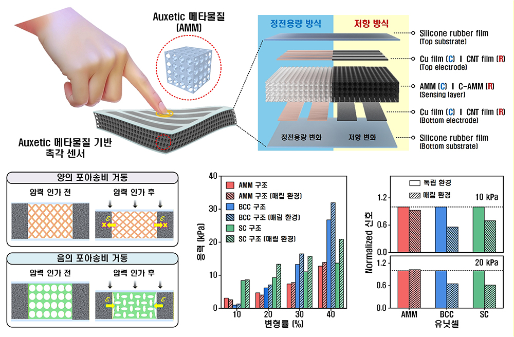 ▲ 오세틱 메타물질 기반 촉각 센서의 구조와 매립 환경 성능 비교