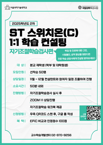 교수학습개발센터에서 2025학년도 2차 ST 스위치온(C) 참여자를 모집하오니, 학생 여러분의 많은 관심과 참여 바랍니다. ☺ 1. 대상: 학부생 및 대학원생(휴학생 제외)2. 모집기간: 2025.10.23.(목)부...