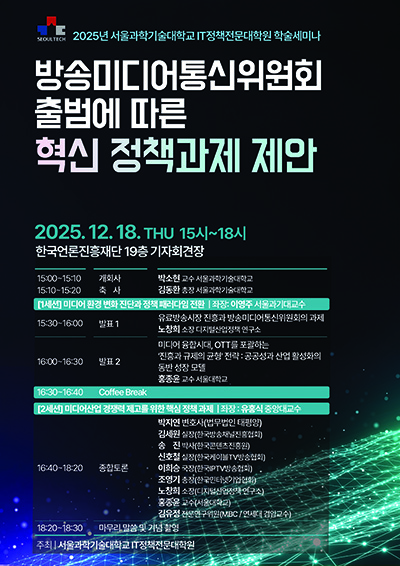 2025년 서울과학기술대학교 IT정책전문대학원 학술세미나방송미디어통신위원회 출범에 따른 혁신 정책과제 제안1. 일시: 2025. 12. 18.(목) 15:00~18:002. 장소: 한국언론진흥재단 19층 기자회견장3...