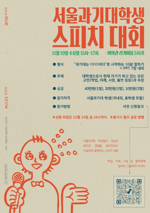 <과기대000> 발칙하게 말하고, 진솔하게 외치자서울과기대 학생들이 기존의 정형화된 발표 방식에서 벗어나, 자신의 생각과 경험을 창의적이고 대담하게 표현할 수 있도록 돕는 말하기 증진 프로그램입니다. 이 ...