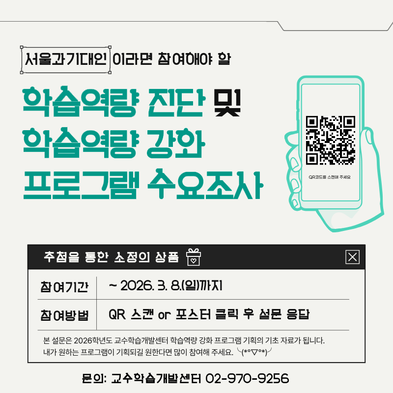 2026학년도 학습역량 진단 및 학습역량 강화 프로그램 수요조사▣ 기간: ~2026. 3. 8.(일)까지▣ 대상: 재학생(학부생 및 대학원생)▣ 방법: QR 스캔 또는 포스터 클릭하여 설문(구글 폼) 응답본 설문은 ...