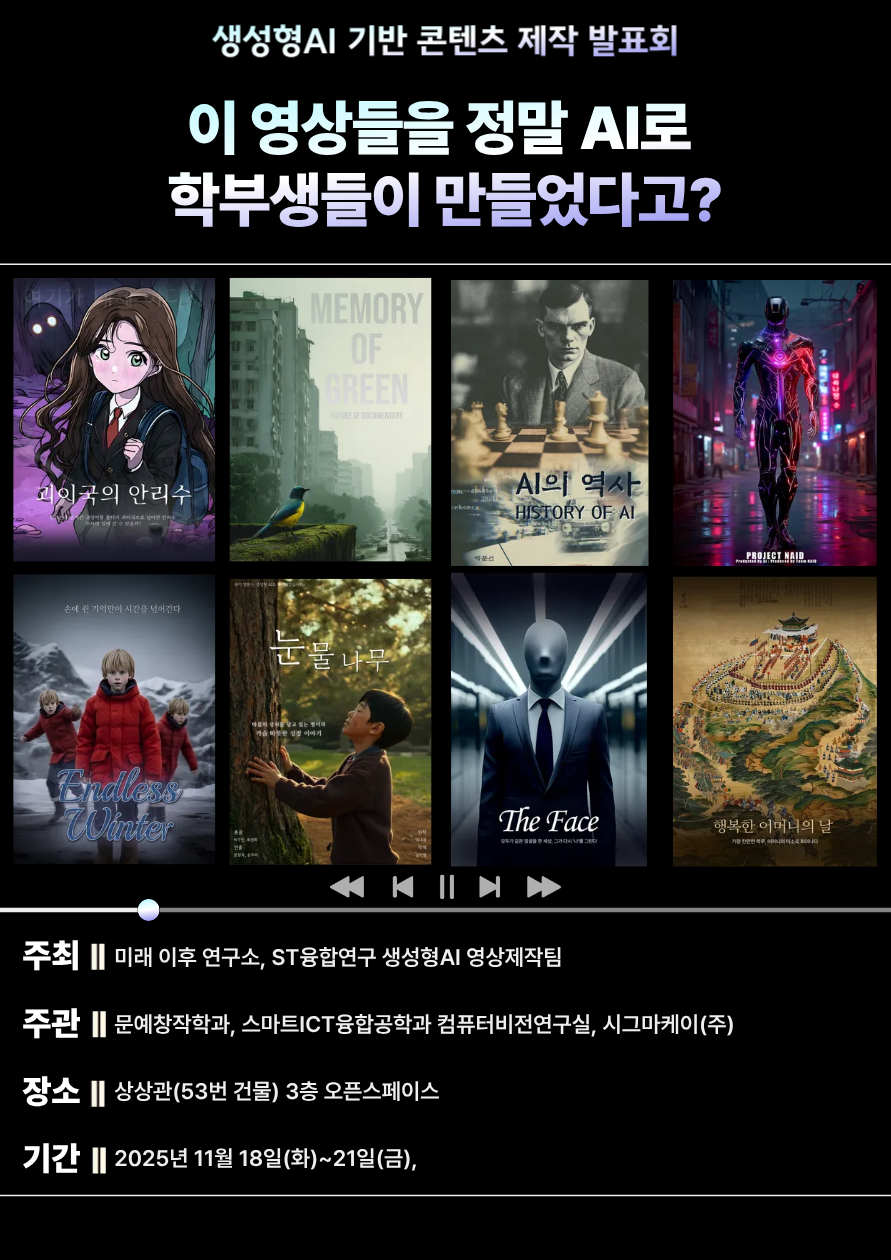 '미래 이후 연구소'는 ST융합연구의 결과로 학부생들이 생성형 AI를 활용하여 제작한 특별한 영상들을 전시합니다.