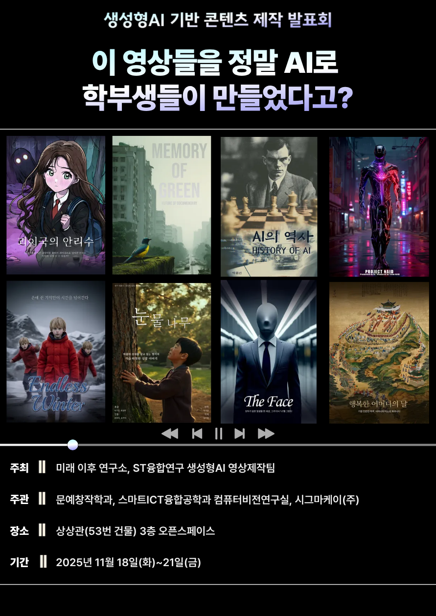 '미래 이후 연구소'는 ST융합연구의 결과로 학부생들이 생성형 AI를 활용하여 제작한 특별한 영상들을 전시합니다.