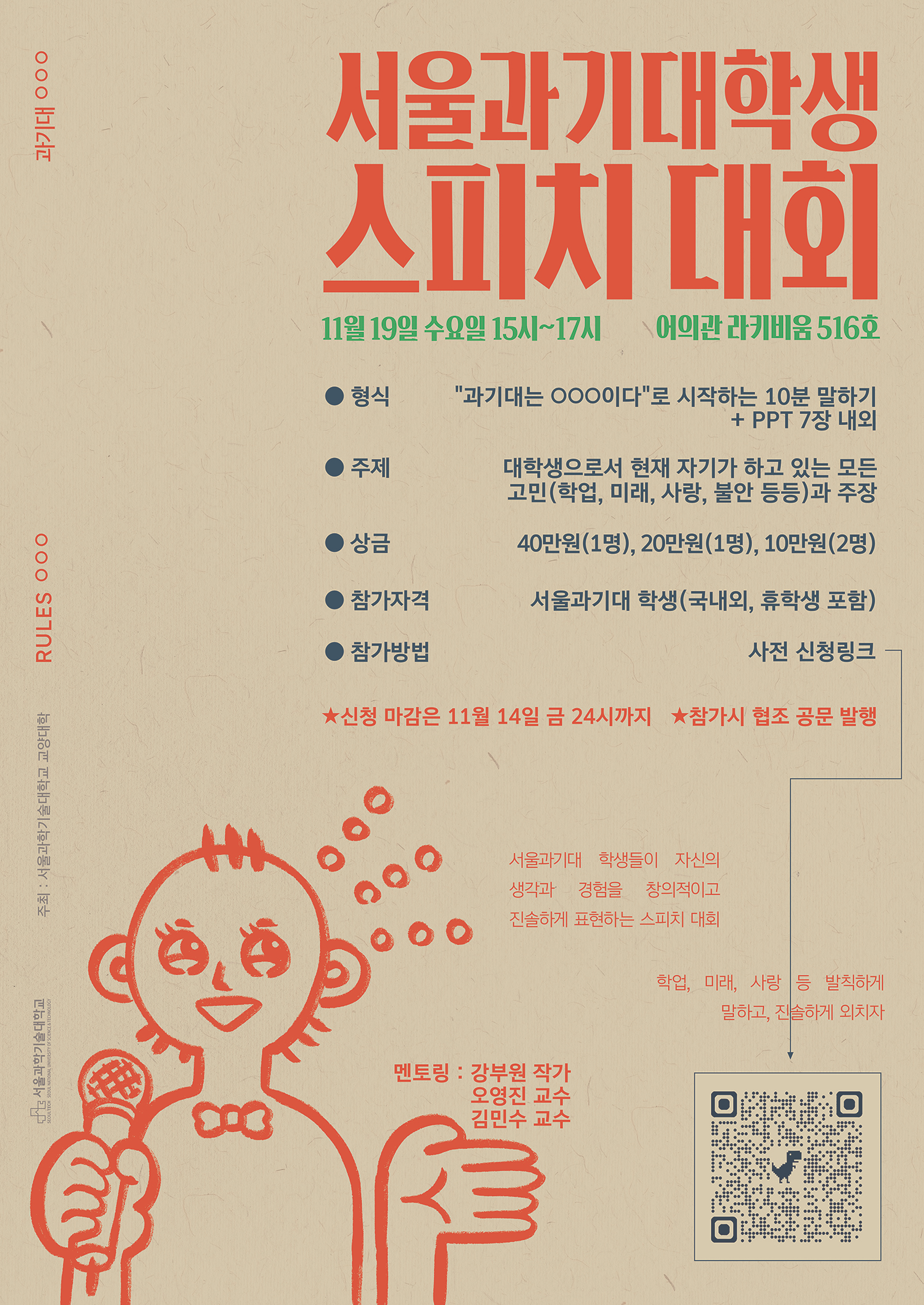 | 제목 | [교양대학] 제1회 서울과기대 스피치 증진대회 참여 안내 | ||||