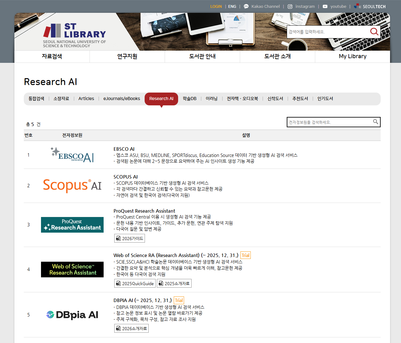 서울과학기술대학교 도서관에서는 더욱 편리하고 신속한 학술정보 검색 환경을 제공하기 위해 AI 기반 자료 검색 서비스를 모아볼 수 있는 [Research AI] 를 신규 오픈하여 운영하니 관심있는 분들의 많은 이용 바랍니다.