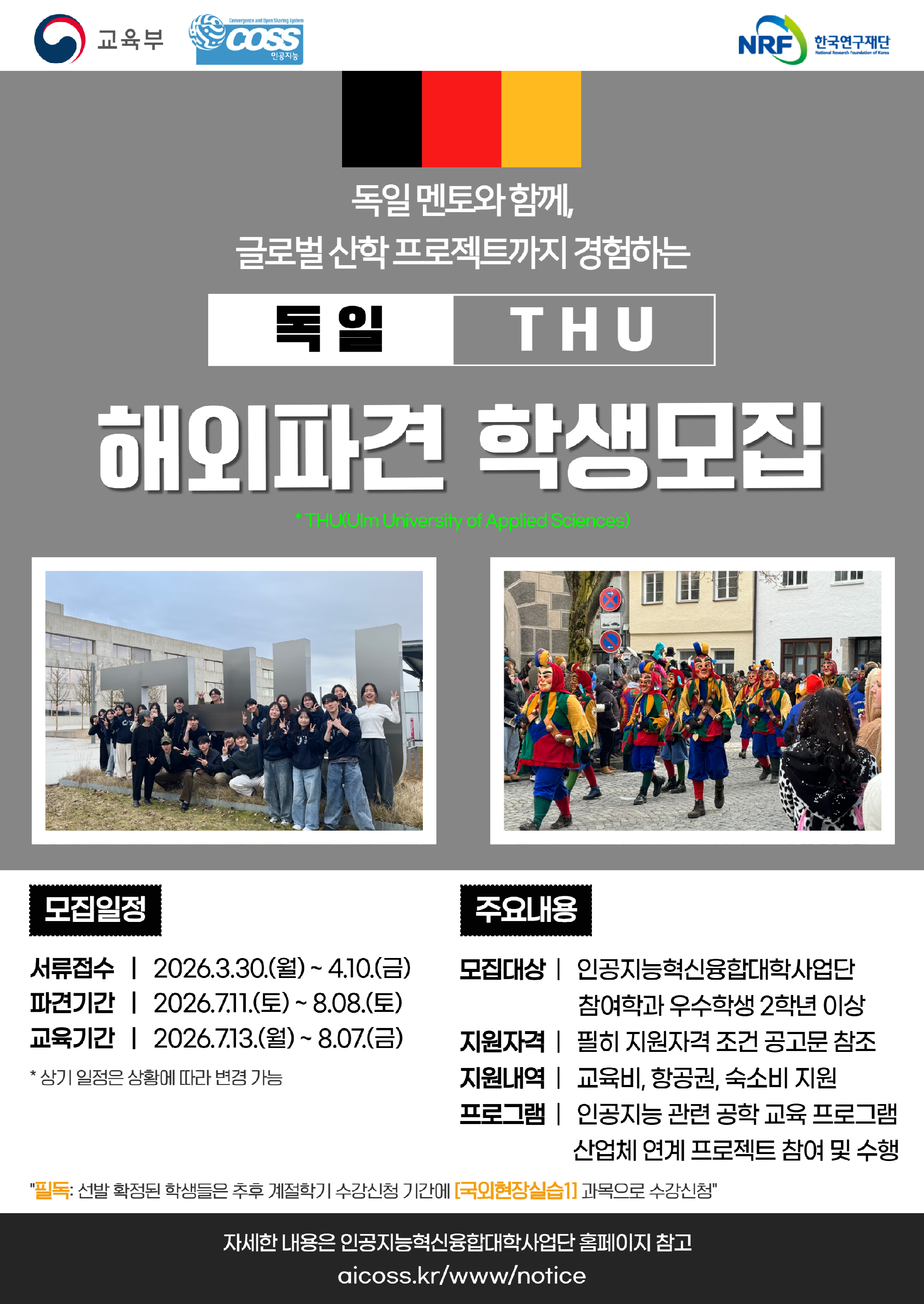 ○ 프로그램명: 2026 AICOSS-THU 글로벌 학생 프로그램 ○ 파견기간: 2026. 7. 11. (토) ~ 8. 8.(토) ※ 교육기간: 2026. 7. 13.(월) ~ 8. 7.(금) ○ 파견기관: THU(Technische Hochschule Ulm/University of Applied Sciences, Germany) ○ 주요내용: Python for Data Science 및 캡스톤디자인 프로젝트 등 ○ 선발인원: 본교 인공지능혁신융합대학사업 참여학과 재학생 3명