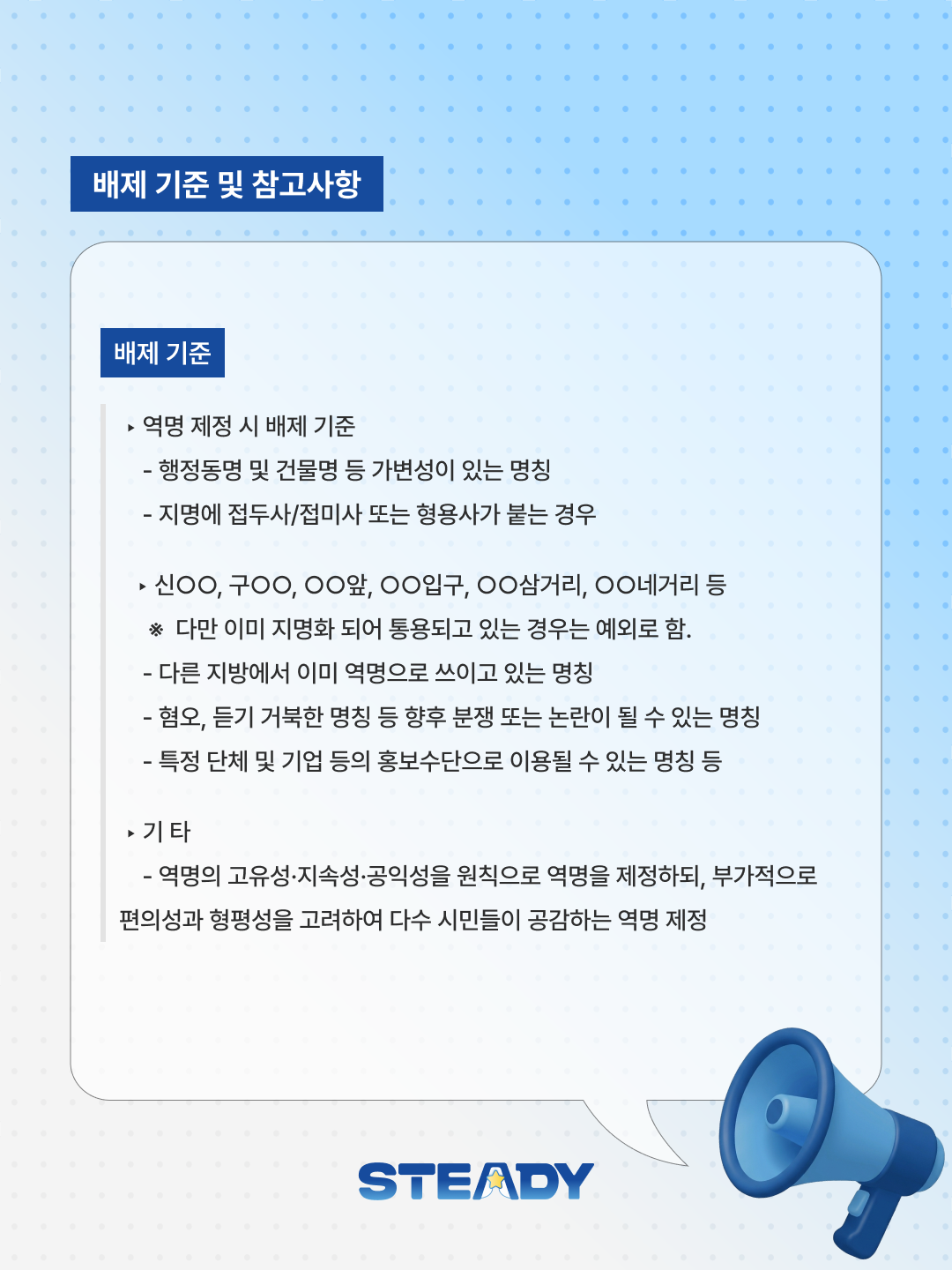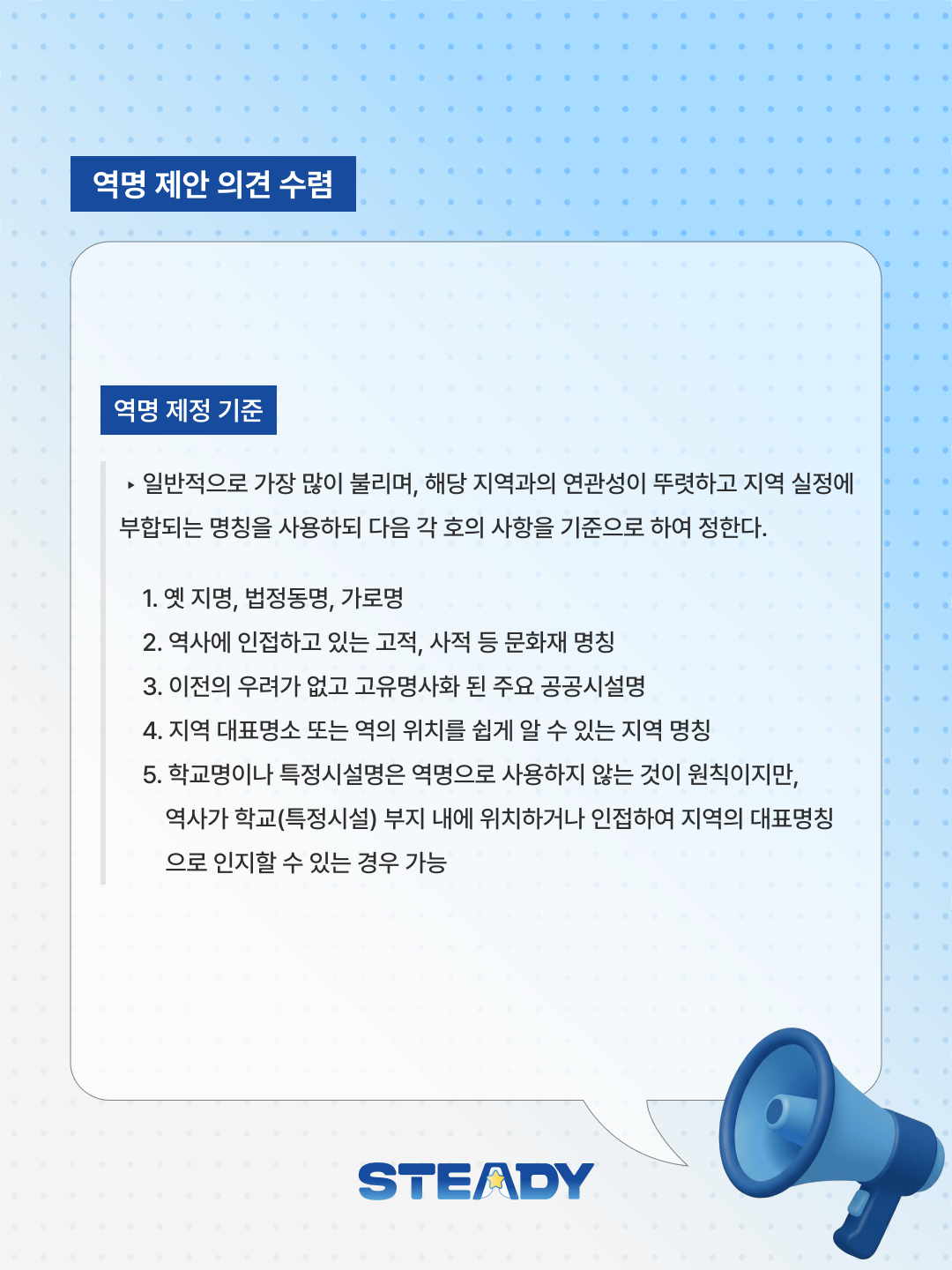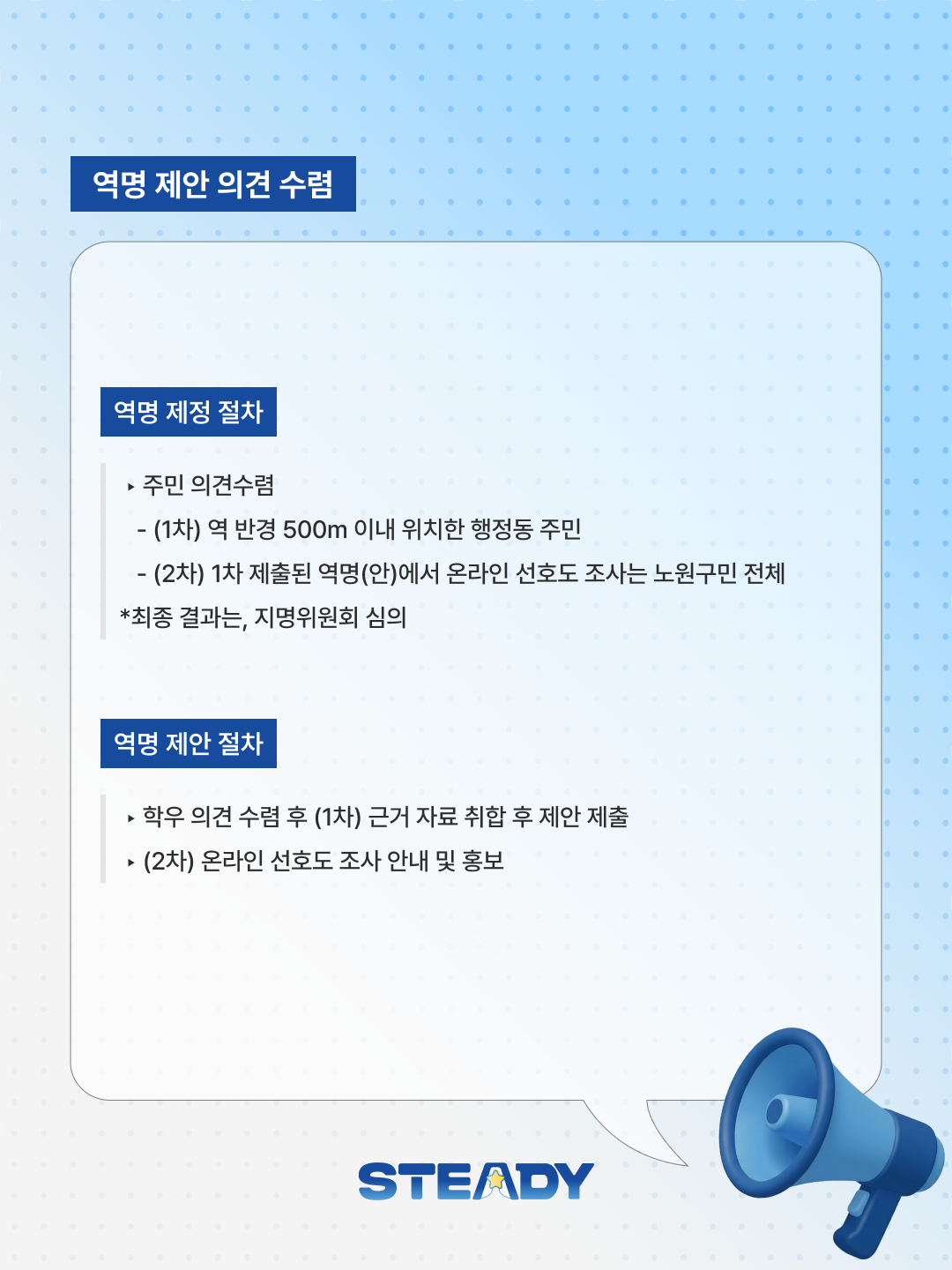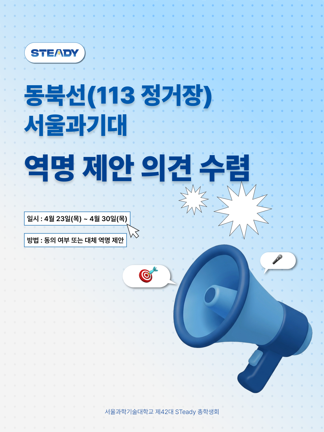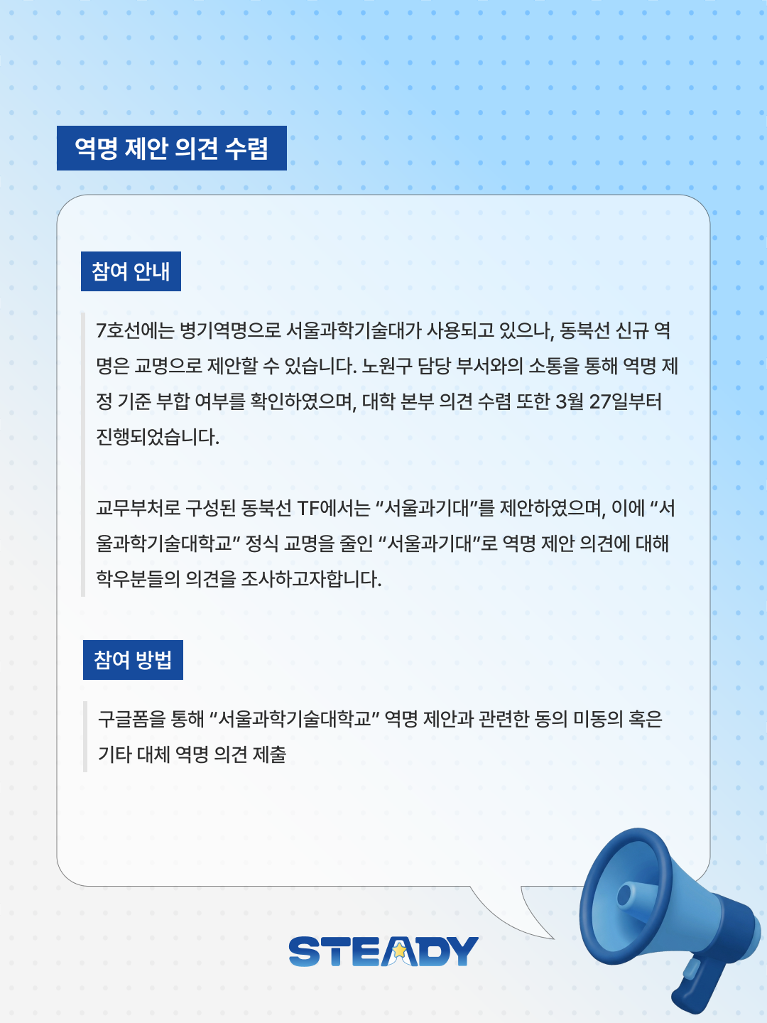 안녕하세요. 제42대 ⭐STeady⭐ 총학생회입니다. 우리 대학의 정체성과 인지도를 높이고, 지역사회와의 연계성을 강화하기 위해 동북선(113정거장) 신규 역명에 “서울과기대”를 제안하는 의견 수렴을 진행합니다! � 참여 안내: 노원구 담당 부서와의 소통을 통해 역명 제정 기준 부합 여부를 확인하였으며, 대학 본부 의견 수렴 또한 3월 27일부터 진행되었습니다. 교무부처로 구성된 동북선 TF에서는 “서울과기대”를 제안하였으며, 이에 “서울과학기술대학교” 정식 교명을 줄인 “서울과기대”로 역명 제안 의견에 대해 학우분들의 의견을 조사하고자합니다. � 역명 제정 기준: � 역명 제정 절차: � 참여 방법: