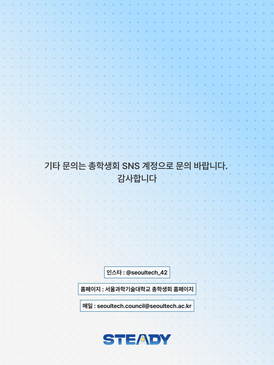 � 이메일: seoultech.council@seoultech.ac.kr ⭐경험 위에 쌓는, 다음 한 걸음 제42대 ������ 총학생회⭐ |