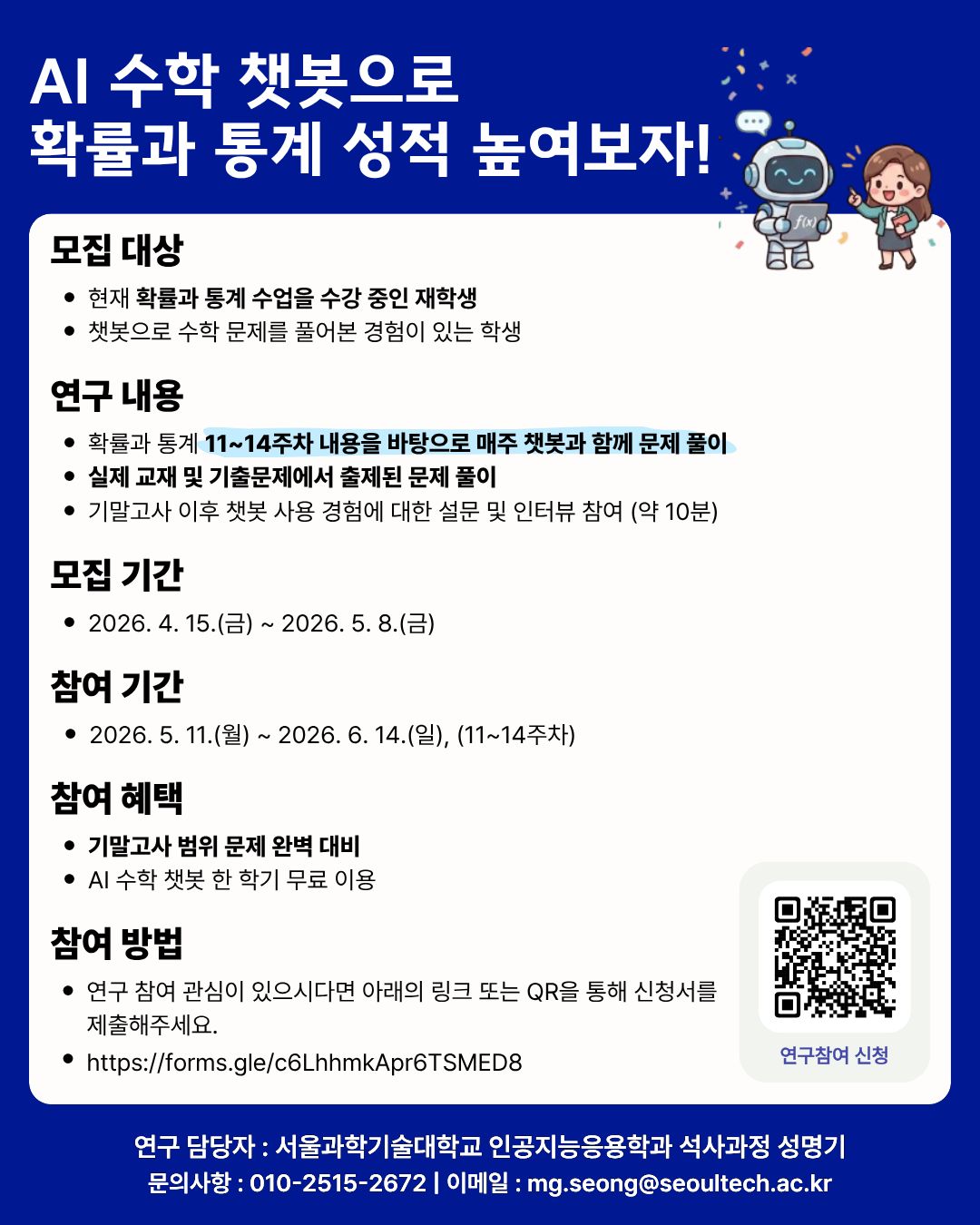 인공지능응용학과 인간중심 인공지능 연구실(SeoulTech HAI LAB)에서 수학 AI 챗봇 활용 기반 확률과 통계 학습 연구에 참여할 학생을 모집합니다.