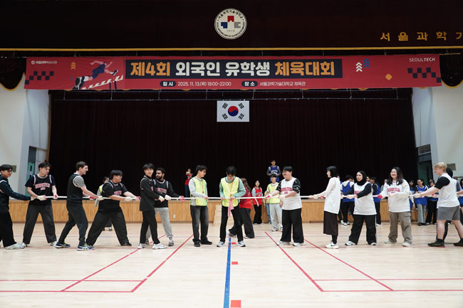 제4회 유학생 스포츠의 날 행사가 2025년 11월 13일(목) 교내 체육관에서 성황리에 개최되었다. 이번 행사는 스포츠 활동을 통해 유학생들의 학업 스트레스를 완화하고, 다양한 국적의 학생들이 서로 교류하며 화합할 수 있도록 지원하고자 마련되었다. 이번 대회에는 학부 및 대학원 학위과정 학생을 비롯해 어학과정, 교환학생, 지원인력 등 총 109명이 참석하였다. 참가자들은 여러 경기에 함께 참여하며 협동과 경쟁의 즐거움을 나누는 시간을 가졌다. 단체줄넘기, 줄다리기, 협동 공튀기기 등 팀워크가 중요한 종목뿐 아니라 우리나라 전통놀이인 투호, 그리고 2인3각을 포함한 장애물달리기 등 총 6종목의 게임이 다채롭게 진행되었다.