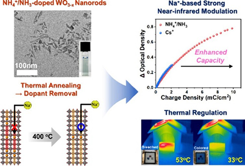 이에 연구팀은 Na+ 전해질이 텅스텐 산화물 격자 내부로 원활히 접근할 수 있는 새로운 소재, 즉 암모늄(NH4+)이 도핑된 헥사고날 구조의 텅스텐 산화물 나노입자를 성공적으로 합성했다. 이를 통해 나트륨 전해질 기반 시스템에서도 리튬 전해질에 필적하는 수준의 전기변색 성능을 구현하는 데 성공했다.