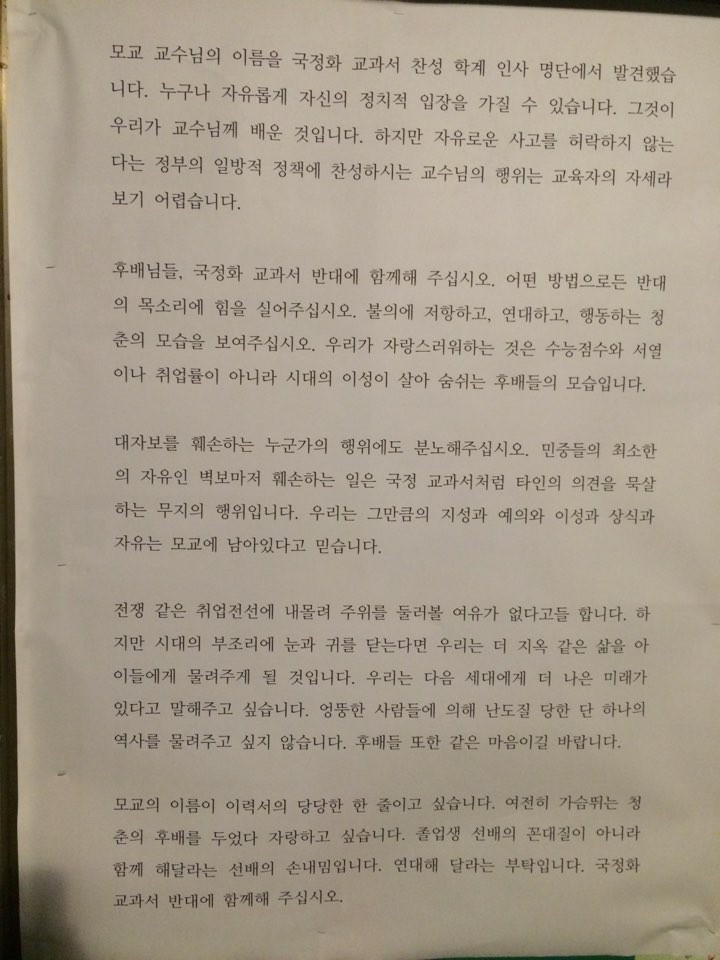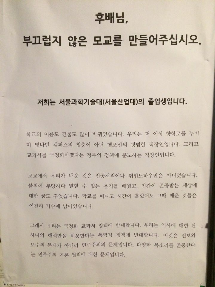 후배님, 부끄럽지 않은 모교를 만들어주십시오.