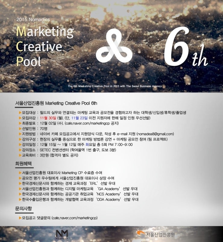 서울산업진흥원과 함께하는 플랫폼 기업 노마딕스의 마케팅교육과정 Marketing Creative Pool 모집을 알립니다. 디지털 노마드 문화를 지향하는 노마딕스는 독립적인 마케터 양성을 위한 다양한 교육 프로그램들을 운영하며 마케팅 실무교육과 공모전으로 현장의 마케팅 방법론을 교육하는 Marketing CP는 이를 위해 존재합니다. cafe.naver.com/marketingcp/1150 보다 실무영역을 중심으로 비즈니스모델링/고객/교육콘텐츠/소셜마케팅의 키워드로 진행되는 Marketing CP에 합류하여, 필드의 방법론을 익히고, 비슷한 관심사를 가진 대학생들과 함께 성장할 대학생 여러분의 지원을 기다립니다. < Marketing CP 모집요강 > 1. 모집대상: 필드의 실무와 연결되는 마케팅 교육을 원하는 대학생/신입생/휴학생/졸업생 2. 모집마감: 11월 30일 (월). (단, 11월 23일 이전 지원자에 한해 일정인원 우선 선발) 3. 최종발표: 12월 02일 (수). (cafe.naver.com/marketingcp 및 개별연락) 4. 선발인원: 70명 5. 교육일정: 12월 15일 ~ 01월 12일 매주 화요일 총 5회 PM 7:00-9:00 6. 교육구성: 마케팅 기획을 중심으로 한 실무이슈에 대한 강연 + 공모전 팀 프로젝트 참여 *5주차 강의 후 모든 일정이 마무리되며, 현장에서 교육 수료증 및 상장이 수여됩니다. *강의일정은 강사 사정에 따라 변동될 수 있습니다. 7. 교육장소: SETEC 컨벤션센터 (3호선 학여울역 도보 1분, 서울특별시 강남구 대치동 514) 8. 교육회비: 3만원. (합격자 별도 공지) 9. 회원혜택 *교육 수료회원에게 서울산업진흥원 대표이사 Marketing CP 수료증 수여. *공모전 결과 우수팀에게 서울산업진흥원 대표이사 상장 수여. *한국경제신문사 신문으로 배우는 경제교육 ‘ERL’ 선발 우대. (cafe.naver.com/marketingcp/430) *한국수출입은행 국제개발협력 교육과정 ‘ODA Academy' 선발 우대. (cafe.naver.com/kusef/22255) *서울산업진흥원 데이터 분석교육과정 'GA Academy' 선발 우대. (cafe.naver.com/marketingcp/935) *한국경제신문사 공기업 취업 역량강화 ‘NCS Academy’ 선발 우대. (cafe.naver.com/marketingcp/692)