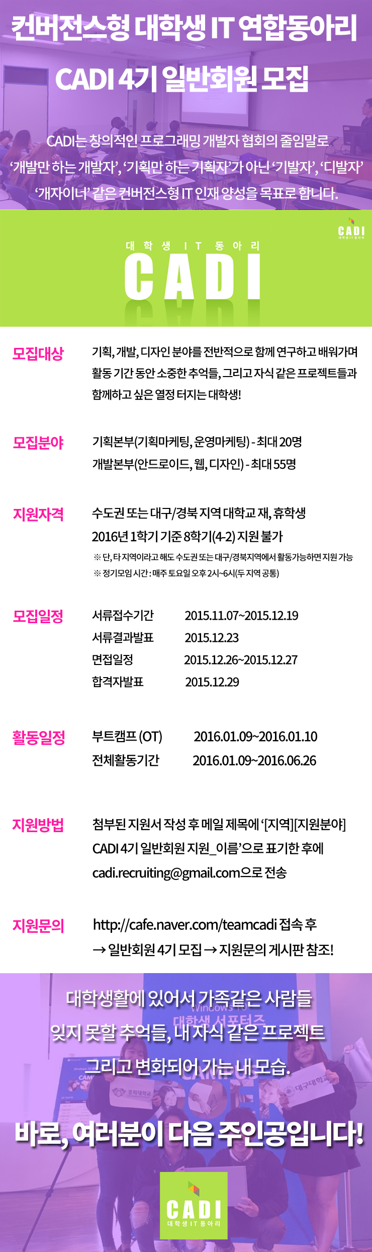![]() CADI는 2014년 5월 앱 개발 스터디에서 시작된 IT 연합동아리입니다. 이번 4기부터는 서울 뿐만 아니라, 대구지역도 함께 활동을 시작하며 기본적인 파트별