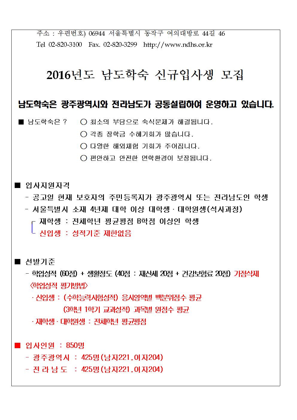 [광주/전남] 2016학년도 남도학숙 신규 모집계획안