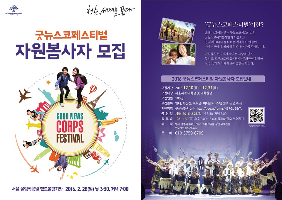 이에 굿뉴스코 페스티벌에서는 전국 10개 도시의 뜻있는 청춘들을 해당 지역별로 50명씩 모집하고자 합니다. 모집분야는 안내(티켓팅, 실내∙외 안내), 로비운영 보조(포토존, 사진전), 행사운영 보조(배급 및 행사장 관리)등 입니다. 자원봉사자들은 하루 동안 굿뉴스코 해외봉사단의 모토인 ‘내 젊음을 팔아 그들의 마음을 사고 싶다’라는 마음을 가지고, 자신들의 값진 젊음을 통해 공연을 보러 오시는 분들의 마음을 열도록 할 것입니다. 더불어, 그들을 통해 관객들은 굿뉴스코 해외봉사단원들의 행복을 함께 느낄 수 있을 겁니다.