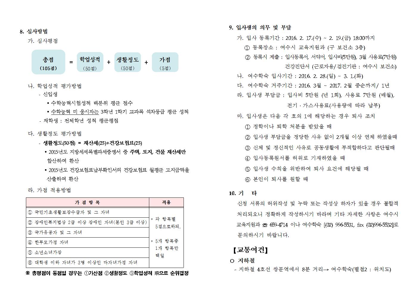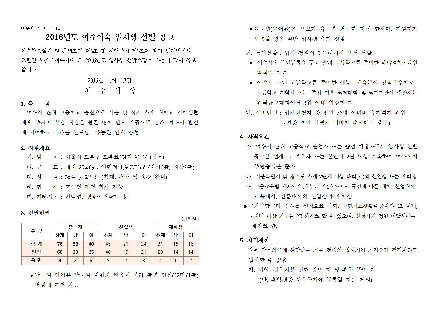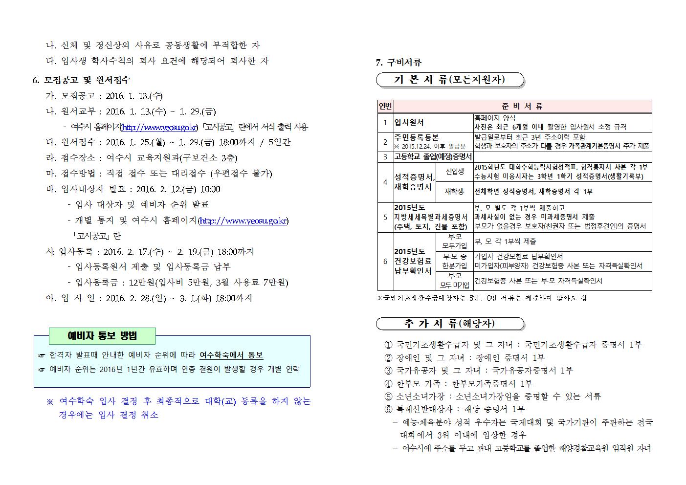 [여수시] 2016학년도 여수학숙(지역장학숙) 신규 모집공고