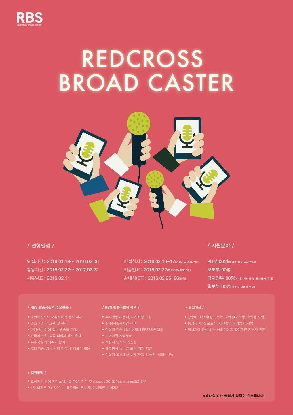 제목 [Redcross] 대한적십자사 대학생 방송국 RBS에서 5기를 모집합니다 (~2/6) 날짜 2016-01-23 조회수 892