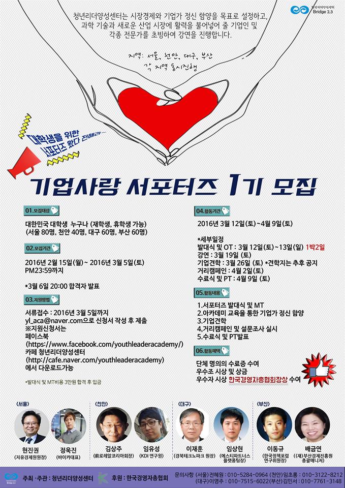★ 기업사랑 서포터즈 : 기존의 청리양(청년리더양성센터)의 아카데미로 유명한 프로그램 명은 ‘시장경제 아카데미’입니다. 기존에는 기업가 정신에 집중되어 청년들의 기업가 정신 확립에 기여하였으나, 이번에는 ‘창조경제’라는 주제를 더하여, 경영과 경제, 창업을 포함한 전문적 강연을 준비하였습니다. 또한 기업 견학과 거리캠페인, 조 프레젠테이션 발표 등 다양한 프로그램을 통해 서포터즈에 지원하는 청년들에게 큰 배움을 제공합니다. [모집 대상] 대한민국 대학생 누구나 (재학생, 휴학생 누구나 가능) (서울 80명, 천안40명, 대구 60명, 부산 60명) [모집 기간] 2016년 2월 15일(월)~ 2016년 3월 5일(토) PM23:59까지 *합격자 발표는 3월 6일 오후8시