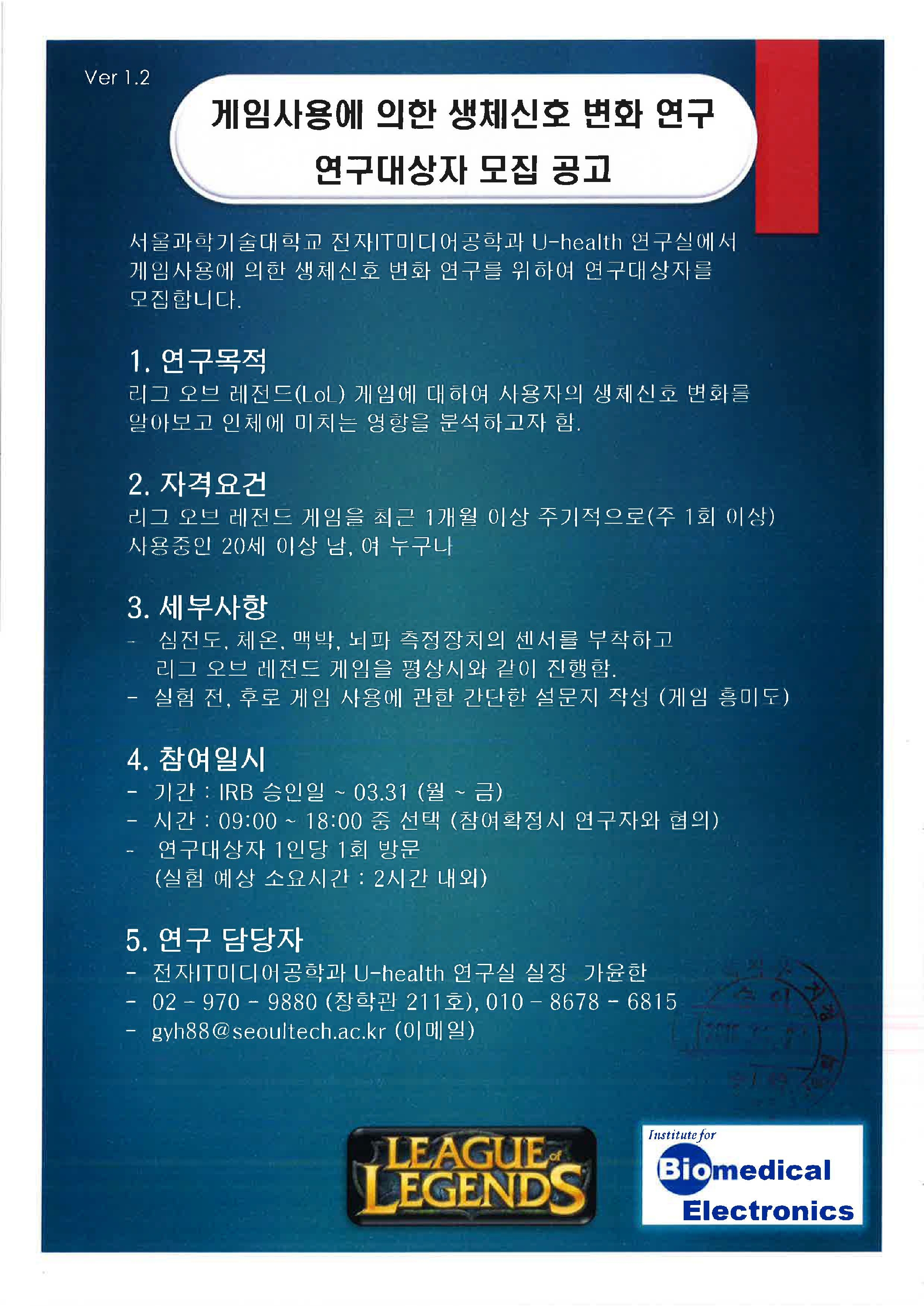 저희 연구실에서는 게임사용에 의한 생체신호 변화 연구를 진행하고 있으며, 아래와 같이 연구대상자를 모집합니다.