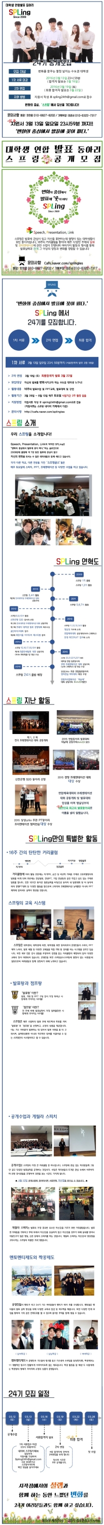 | 제목 | [SPLing] 대학생 연합 발표동아리 ‘스프링 24기’ 공개모집(~3/13) | 날짜 | 2016-03-08 | 조회수 | 841 |