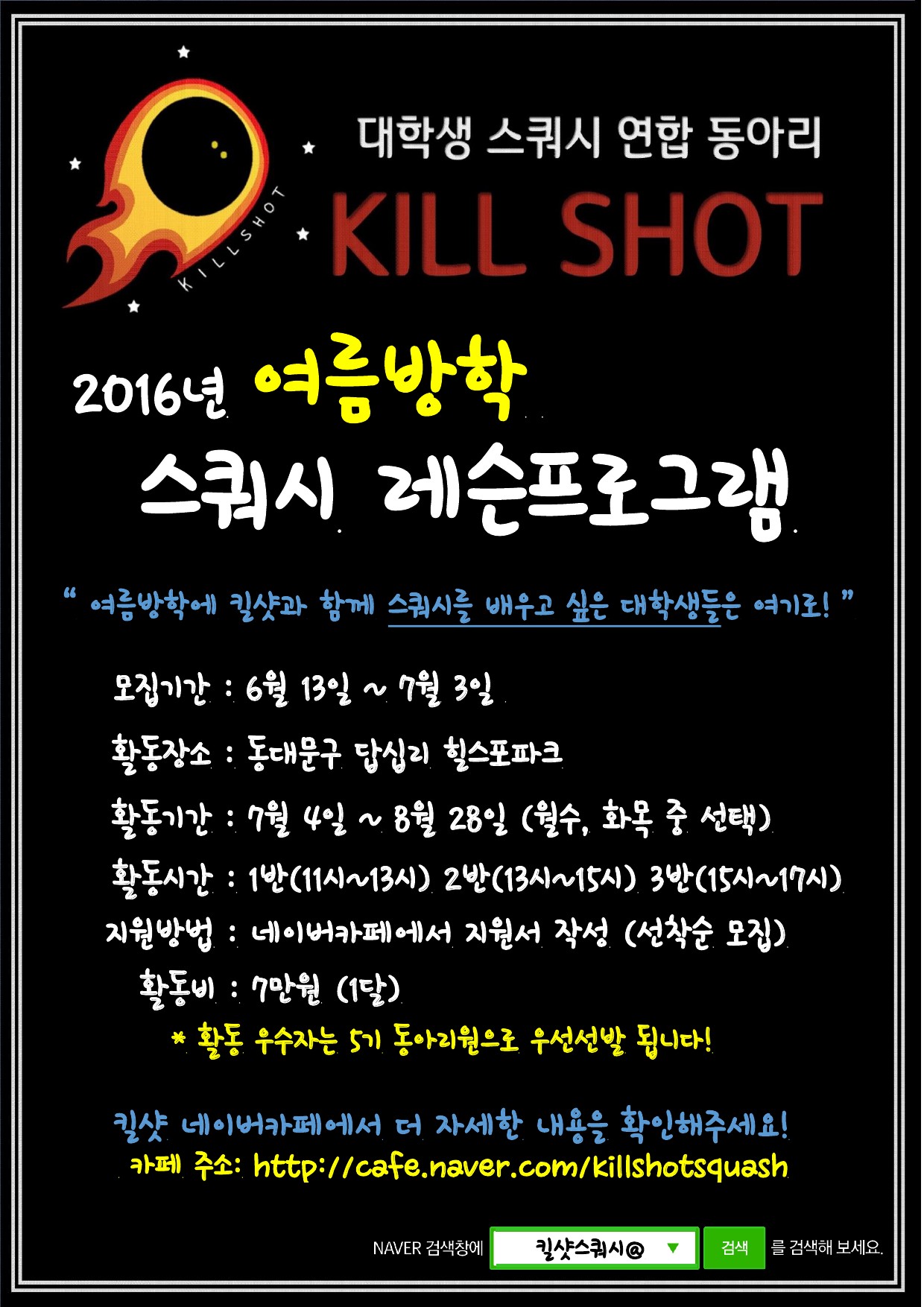 2016 여름방학 킬샷 스쿼시 레슨프로그램