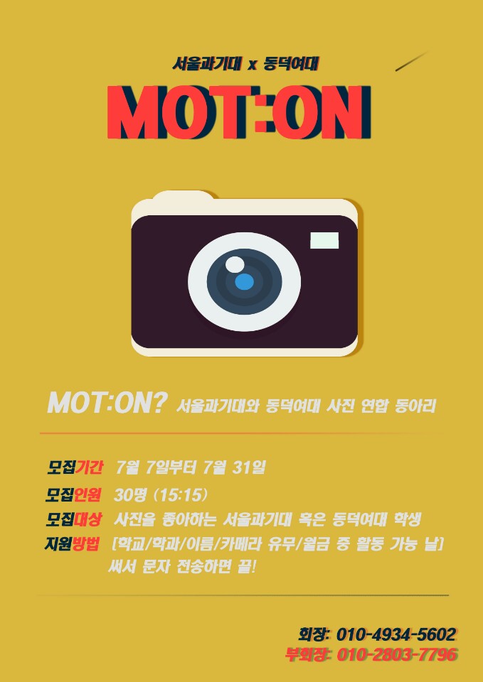 이번에 처음으로 만들어진 사진동아리 motion 입니다, 현재 1기 모집중에 있으며 한달정도 활동하고 있습니다. 방학중에는 매주 월금 서울근교지로 출사나가고 있으며 사진뿐만 아니라 여러 친목활동도 하고 있습니다 ㅎㅎ 궁금한 사항 있으면 언제든지 연락주세요 ~!