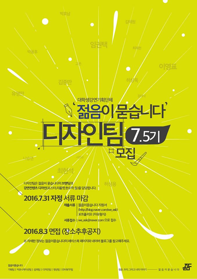 대학생 강연 기획단체 [젊음이 묻습니다]에서 함께할 디자인팀 7.5기를 모집합니다.