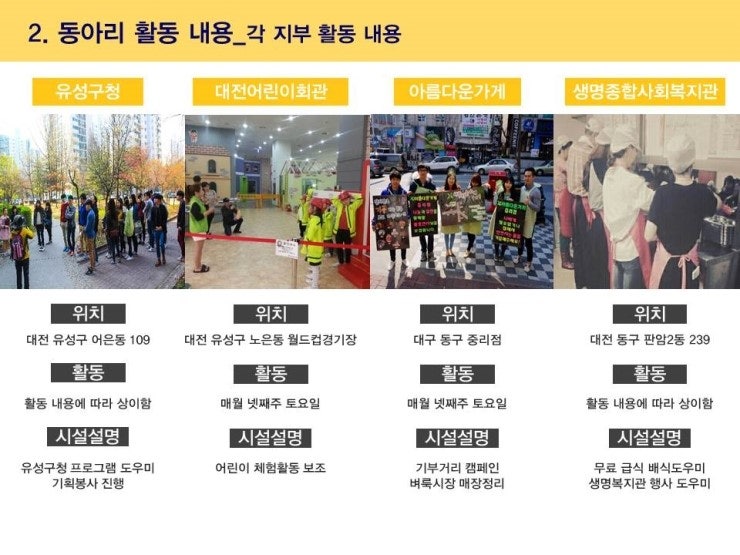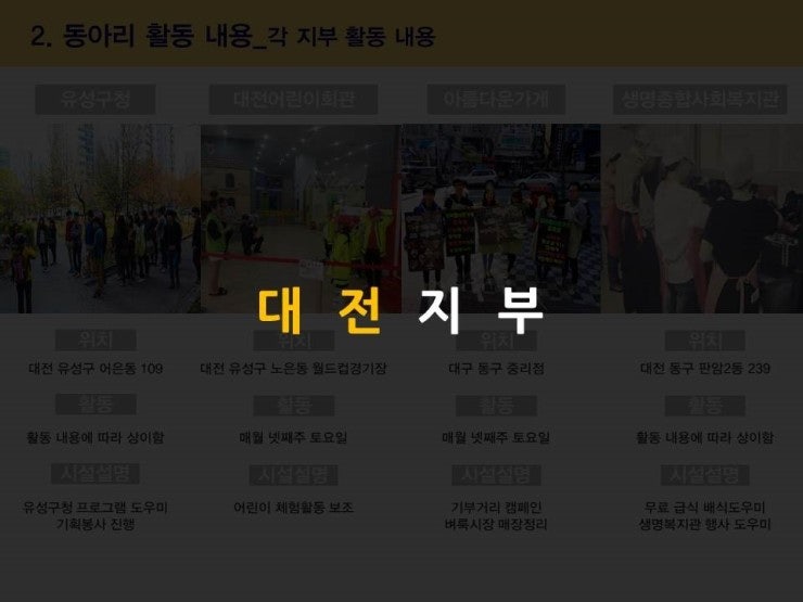 9) 활동 지역 서울(동부,서부,남부,북부), 경기, 대전