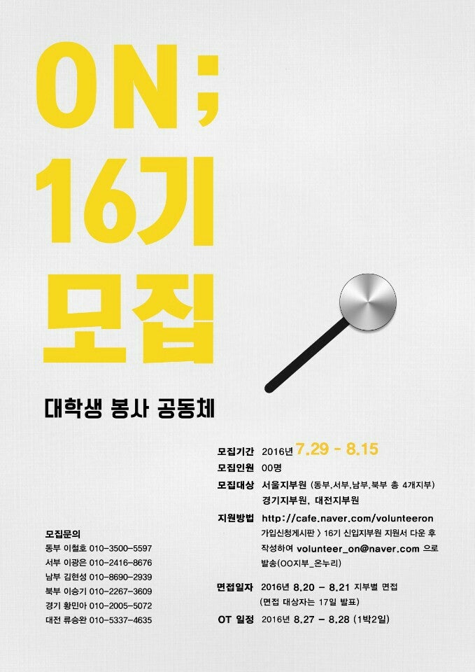 -> 지원서 파일의 제목은 (ON-16기-희망지부) 성명-학교명 으로 반드시 통일해주세요