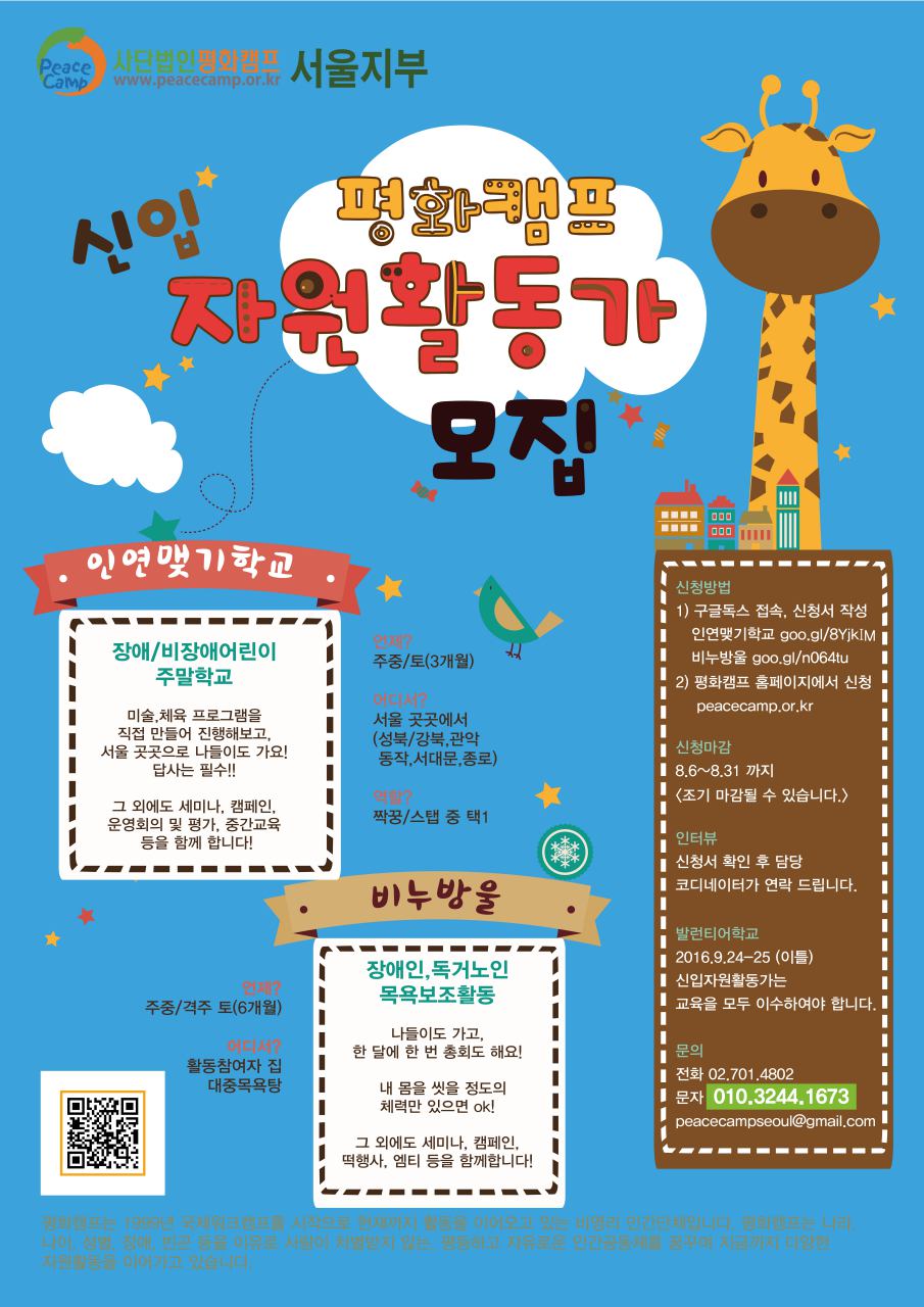 | 제목 | [평화캠프서울지부] 하반기 인연맺기학교/비누방울 신입자원활동가를 모집합니다! (~8/31) | 날짜 | 2016-08-18 | 조회수 | 899 |