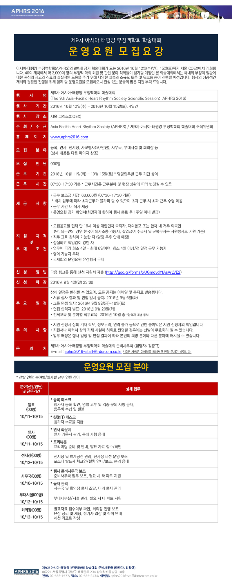 아시아•태평양 부정맥학회(APHRS)의 9번째 정기 학술대회가 오는 2016년 10월 12일(수)부터 15일(토)까지 서울 COEX에서 개최됩니다. 행사의 성공적인 개최와 원활한 진행을 위해 함께 할 운영요원을 모집하오니 관심 있는 분들의 많은 지원바랍니다. 운영요원 신청은 아래 링크를 통해 신청하시면 되며, 자세한 사항은 모집요강을 참고해 주시기 바랍니다.