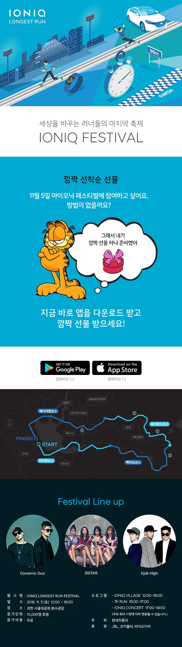 ㅇ대회명: 현대 아이오닉 롱기스트런 페스티벌 ㅇ일시: 2016. 11. 5.(토) 12:00(정오) ㅇ장소: 과천 서울대공원 ㅇ신청방법: [구글스토어]- [아이오닉 롱기스트런] 어플 다운 - 0.1km ~ 1km 러닝 진행 후 [응모하기]