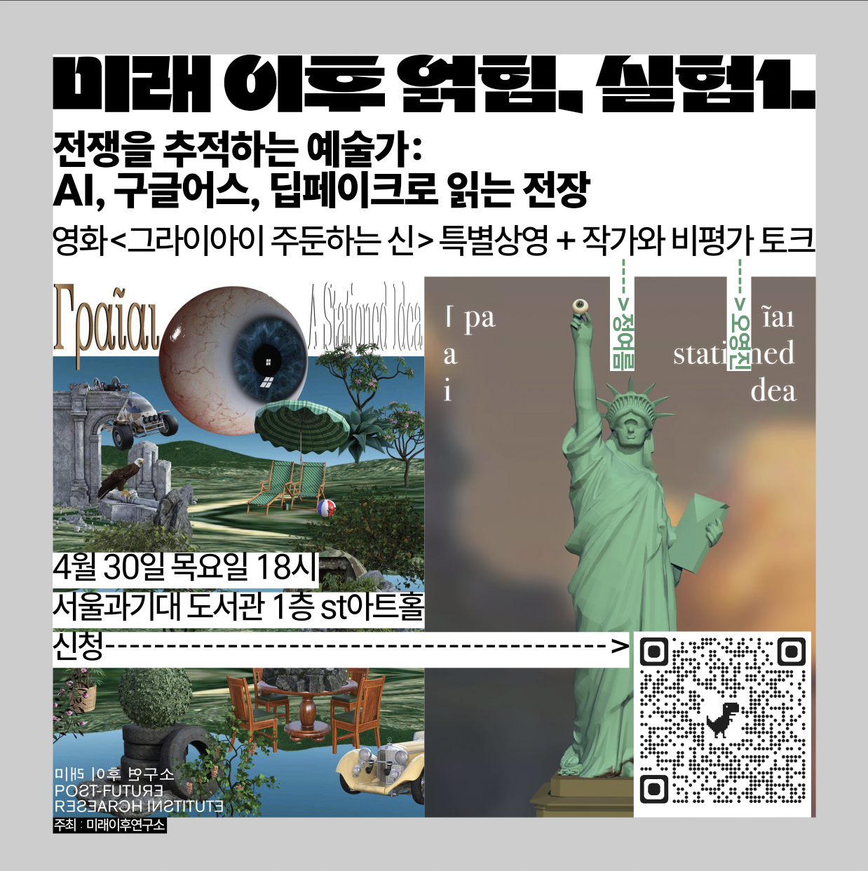 미래 이후 연구소 콜로키움 시리즈「미래 이후 얽힘, 실험1」 전쟁은 더 이상 전장에만 머물지 않는다.위성 사진과 딥페이크 이미지, 인터넷 밈처럼 부서지고 흩어진 데이터의 표면에도 이미 스며들어 있다. 이번 미래이후연...
