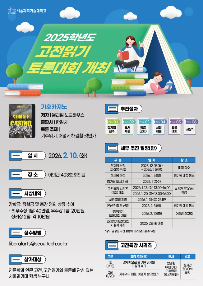 ★ 2025학년도 고전읽기 토론대회 개최 안내 서울과학기술대학교 교양대학에서는 인문 고전에 대한 깊이 있는 이해와 비판적 사고 역량을 기르기 위해**「2025학년도 고전읽기 토론대회」**를 개최합니다. 이번 토론대회...