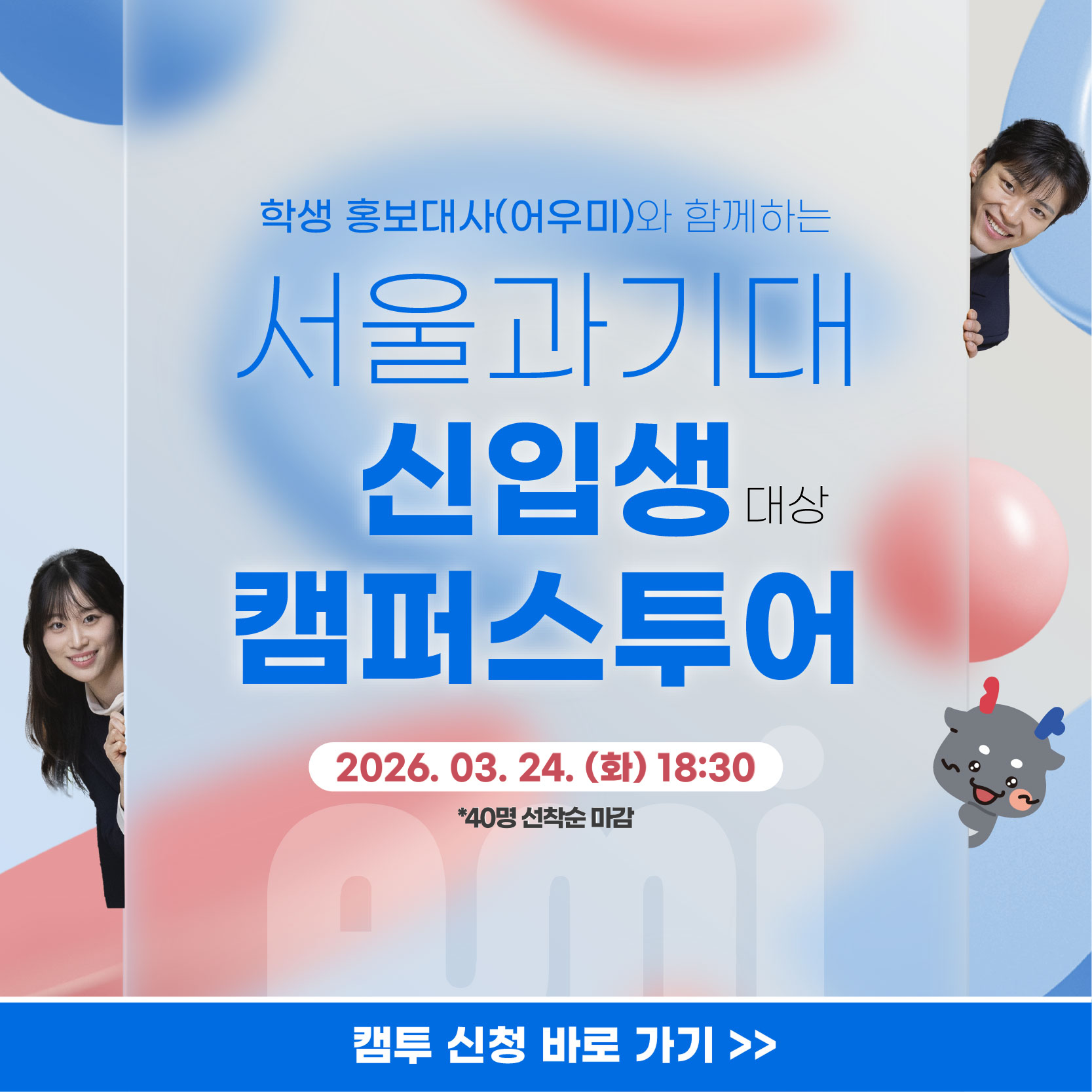 ✨ 학생 홍보대사와 함께하는 서울과기대 신입생 캠퍼스투어 ✨서울과기대 입학하여 분주하죠?신입생 여러분 학교 구석구석을 알아보는 캠퍼스투어를 지금 신청해보세요 💙📌 캠퍼스투어- 일시: 2026.3.24.(화) 1...