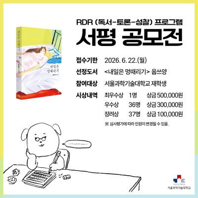 2026학년도 1학기 교양교과-비교과 연계 RDR 프로그램 서평공모전에 관심 있는 학생들은 기한 내에 꼭 참여 바랍니다. ∎ 접수기간: ~ 2026. 6. 22. 종강일∎ 참여대상: 현재 우리대학 재학생 누구나∎ 선...