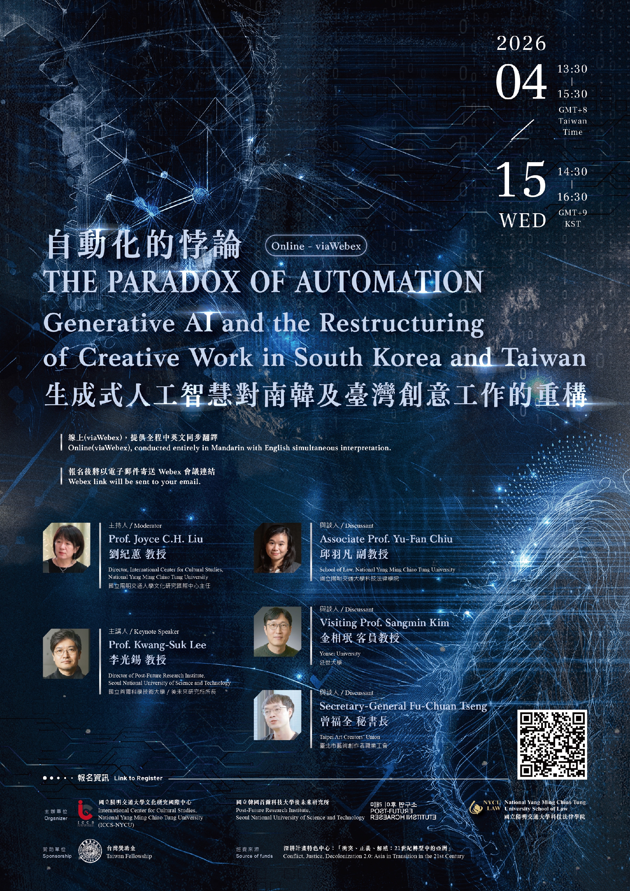 본 행사는 국립 서울과학기술대학교 미래이후연구소와 대만 국립 양밍 교통대학교 문화연구 국제센터(ICCS)가 공동 주최하며, 생성형 AI가 동아시아 창의 노동에 미치는 재구조화 양상을 탐구합니다.