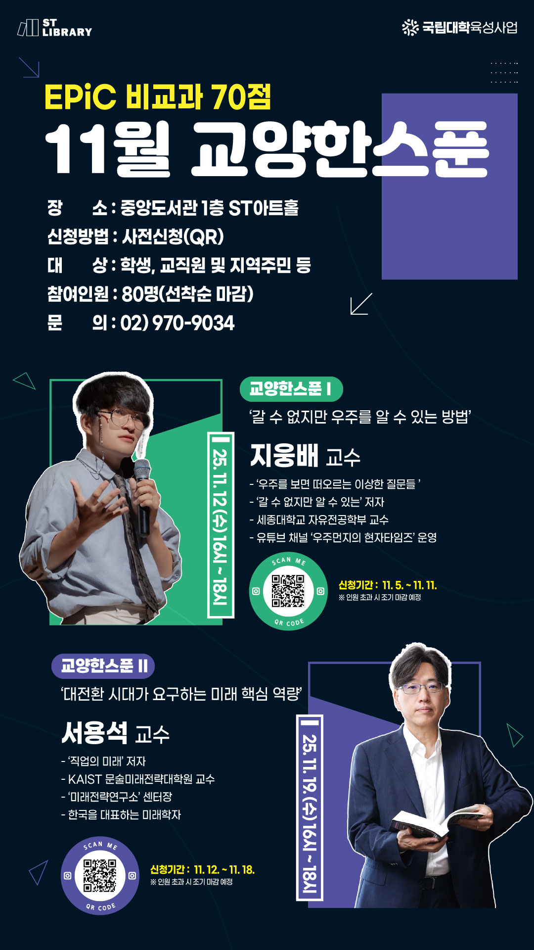 이번 교양한스푼은 여러분과 함께 우주를 여행해보는 시간을 준비해보았습니다. 많은 관심과 참여 부탁드립니다.