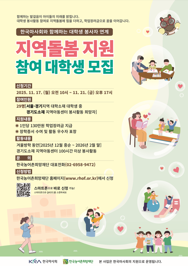 [한국농어촌희망재단] 2025년 대학생 봉사자 연계 지역돌봄 지원사업(겨울방학) 참여대학생 모집 안내 |