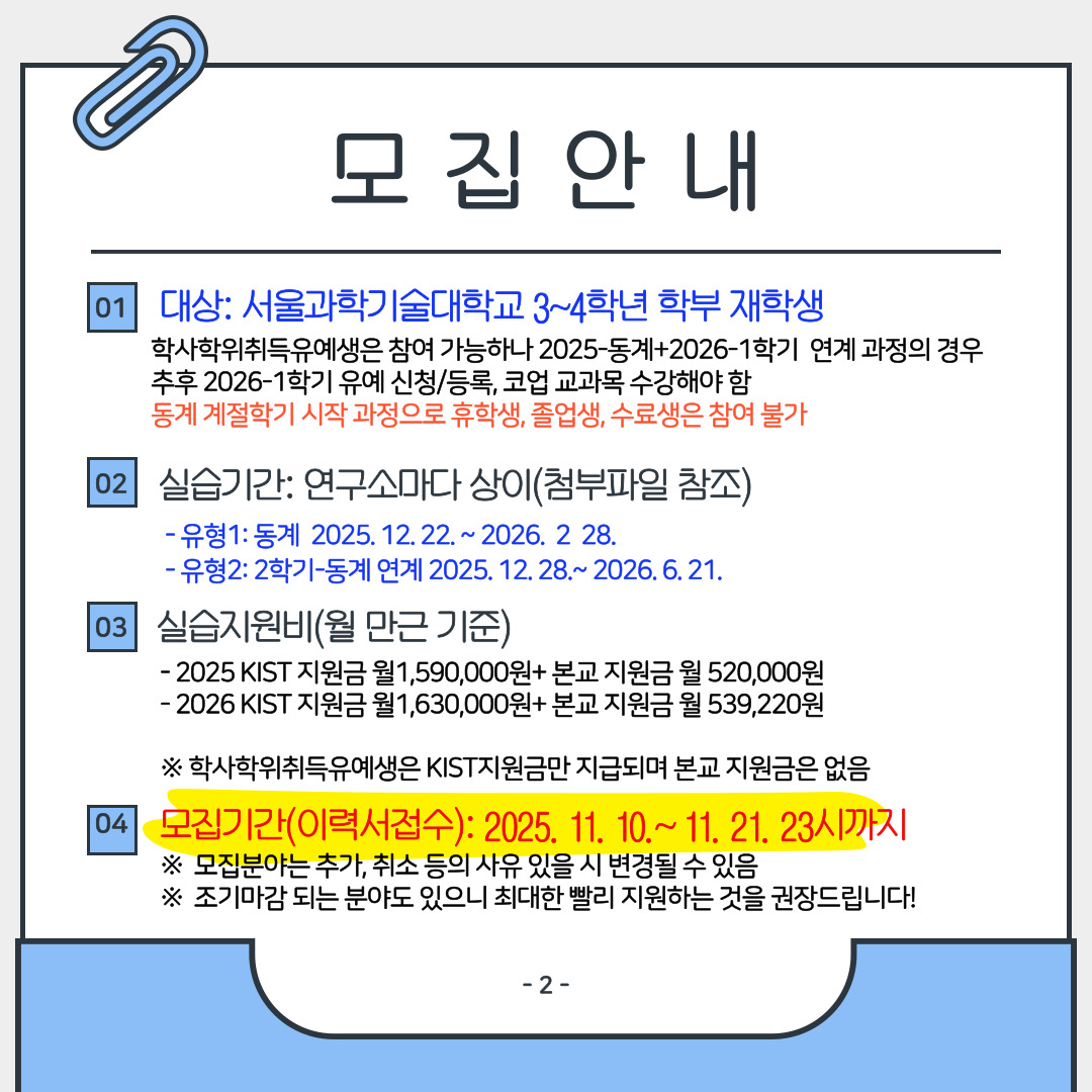 1. 추진 개요 □ 대상 기업: 한국과학기술연구원(KIST) 실습장소: 서울특별시 성북구 화랑로14길 5(하월곡동) 한국과학기술연구원 홈페이지: https://www.kist.re.kr/ko/index.do □ 모집 대상 - 지원 대상자: 서울과학기술대학교 3~4학년 학부 재학생 (2025학년도 동계, 2026-1학기 현장실습 교과목 수강이 가능한 학생만 지원해주세요) ※ 학사학위유예생은 동계+2026-1학기 연계 과정의 경우 추후 2026-1학기 유예 신청/등록 및 코업, 코업프로젝트 교과목을 수강신청 한 학생에 한 해 참여 가능 ※ 동계 부터 시작되는 과정으로 현장실습 교과목 수강이 불가한 휴학생, 졸업생, 수료생, 휴학생은 참여 불가