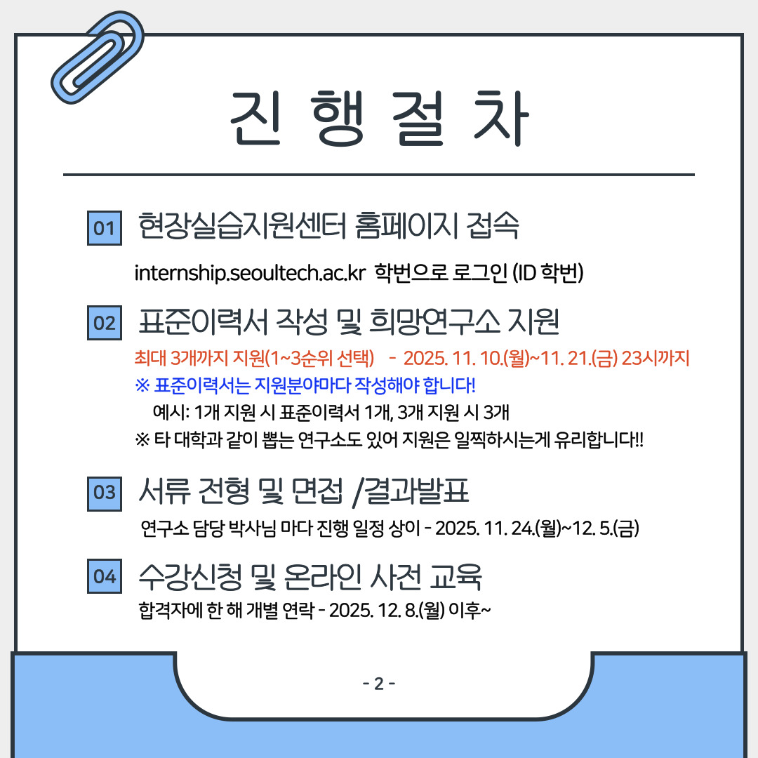 문의: 현장실습지원센터 02-970-9003, internship2@seoultech.ac.kr