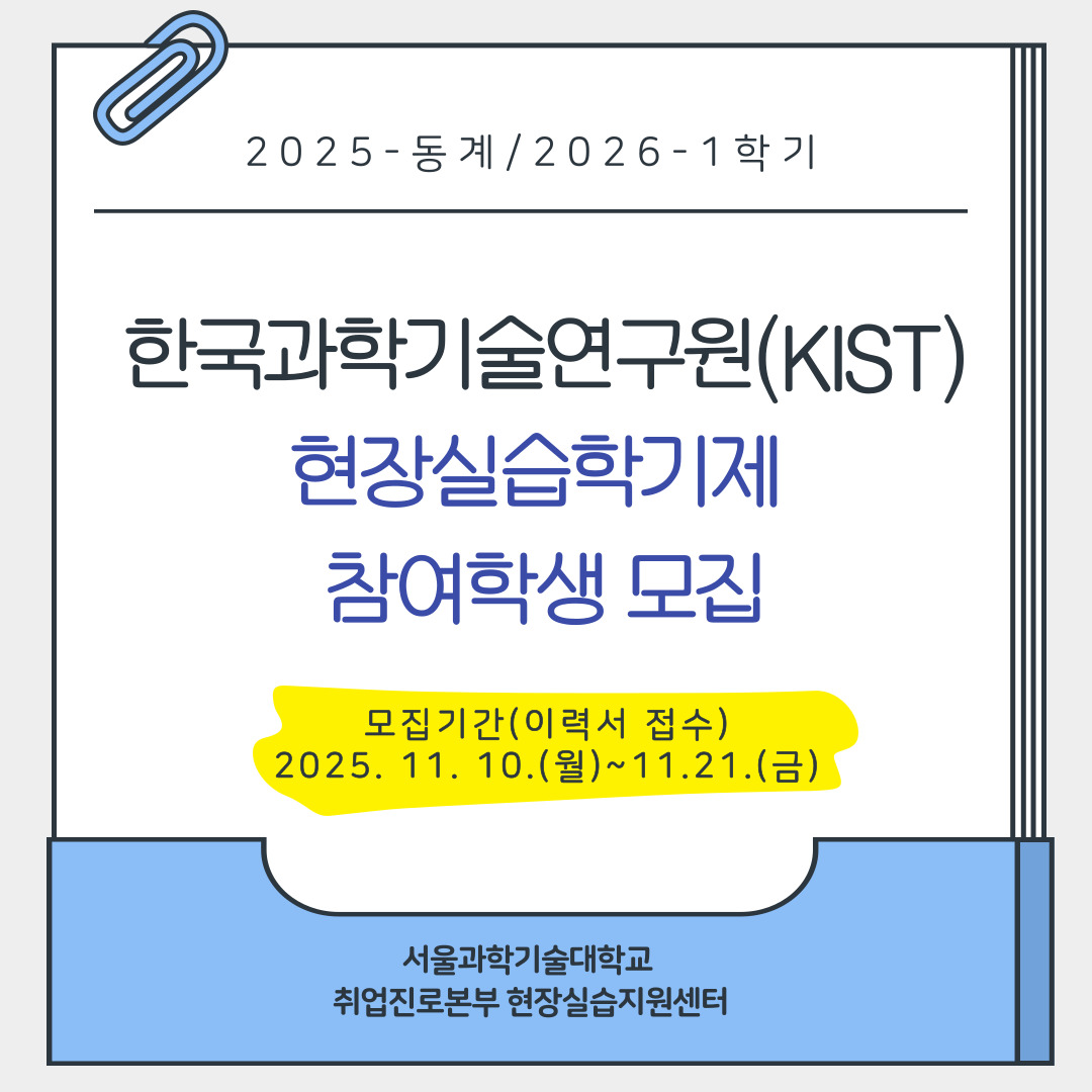 | 제목 | (분야추가) 한국과학기술연구원(KIST) 현장실습 참여학생 모집 안내(2025-동계+2026-1학기 연계) | ||||