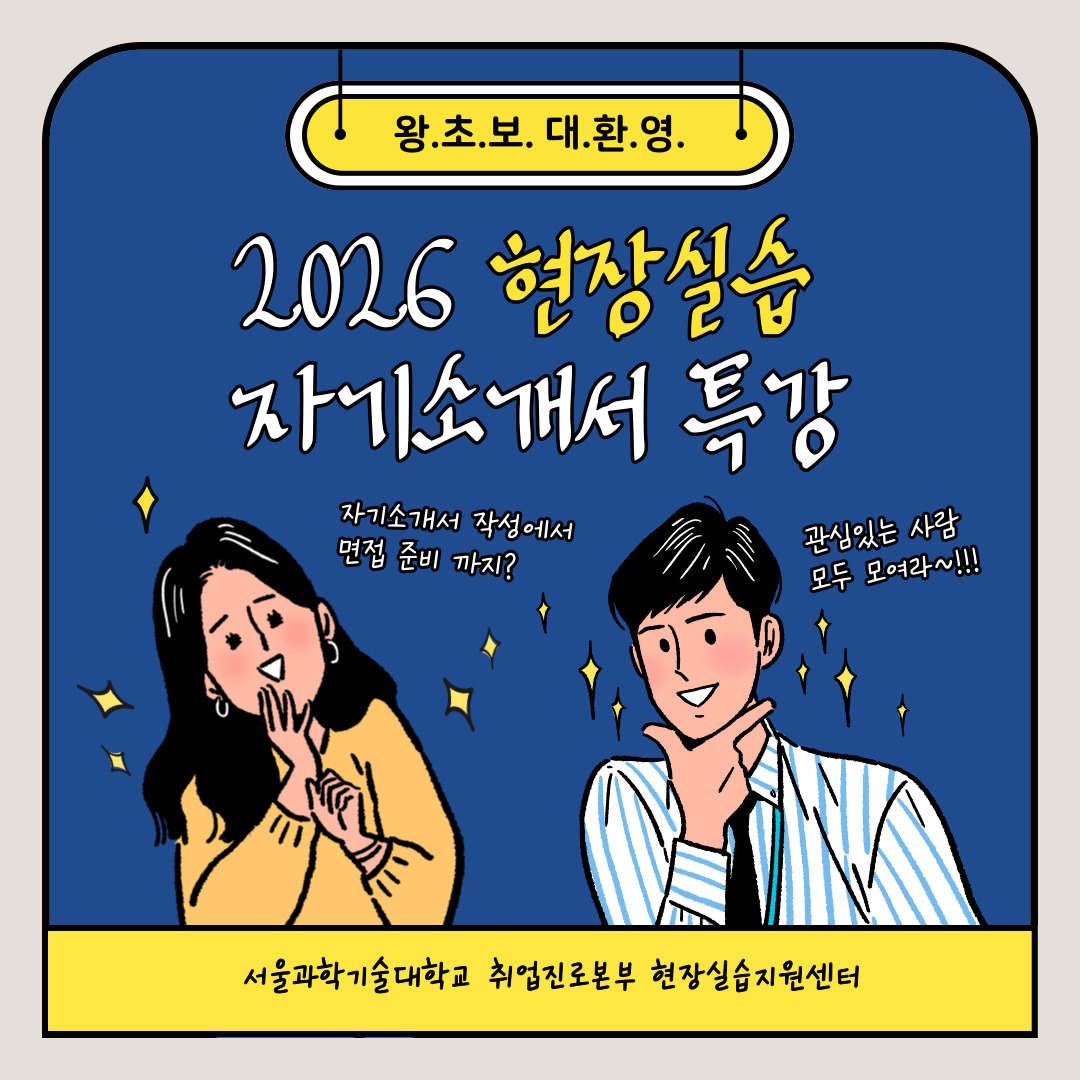 취업진로본부 현장실습지원센터에서는 2026-하계 및 2학기 현장실습 학생 모집을 대비하여 현장실습 자기소개서 특강을 운영하오니 관심있는 학생들의 많은 신청바랍니다. 현장실습에 관심있는 학생 외에도 자기소개서와 면접 준비에 관심이 있는 본교 학생이라면 누구나 참여 가능합니다!