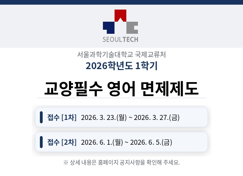 | 제목 | 2026학년도 1차 교양필수 영어 교과목 면제신청 추진 일정 알림 | ||||||||||||