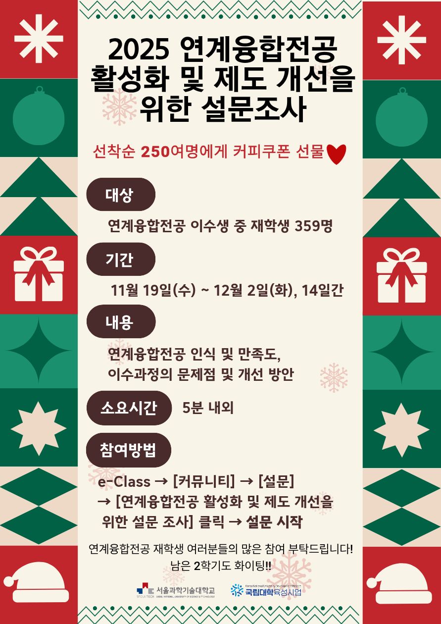 2025학년도 연계융합전공 활성화 및 제도 개선을 위한 설문조사가 시작되었습니다.