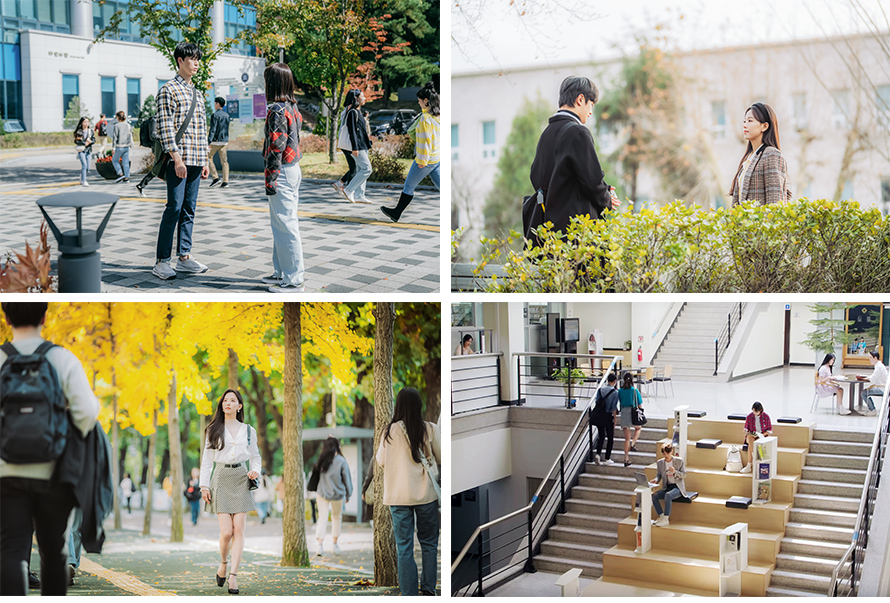 ▲(우측 상단부터 반시계 방향으로) 드라마「간 떨어지는 동거」 다산관, 다빈치관, 향학로, 드라마 「연애플레이리스트 시즌3」 중앙도서관